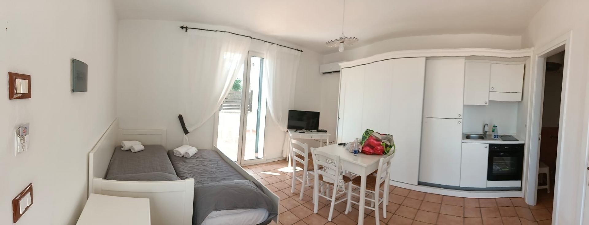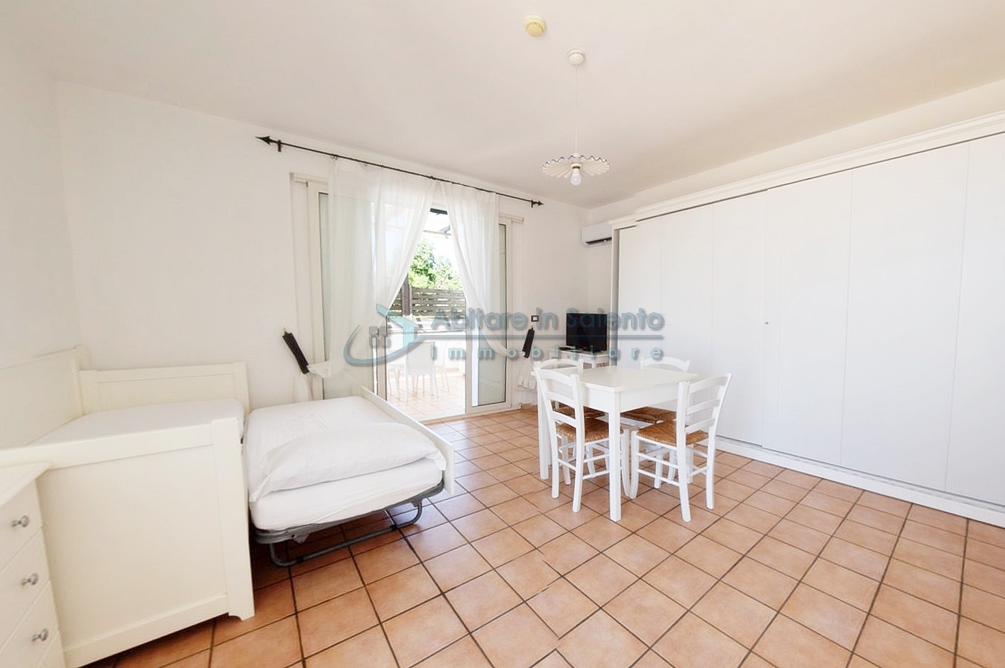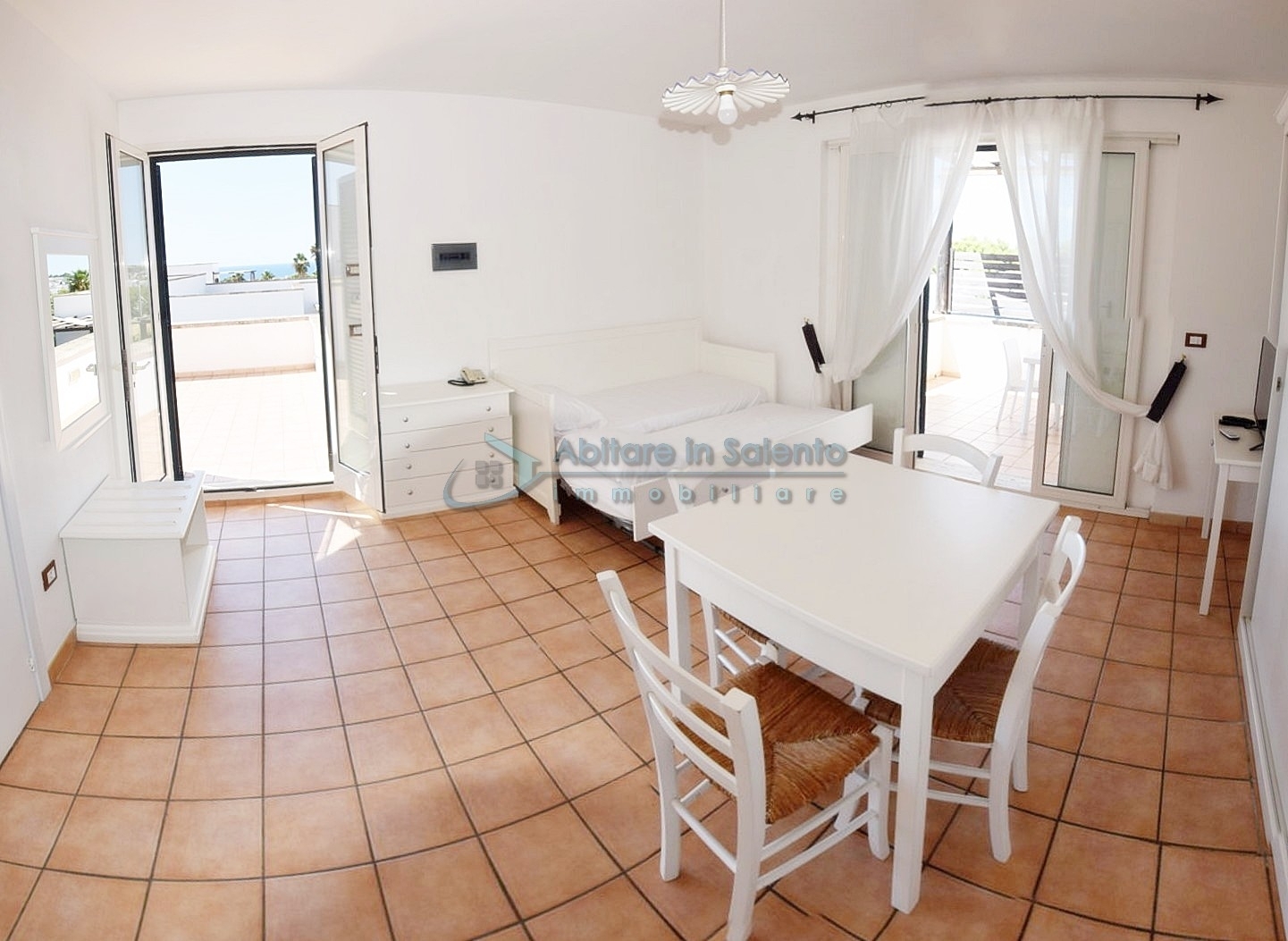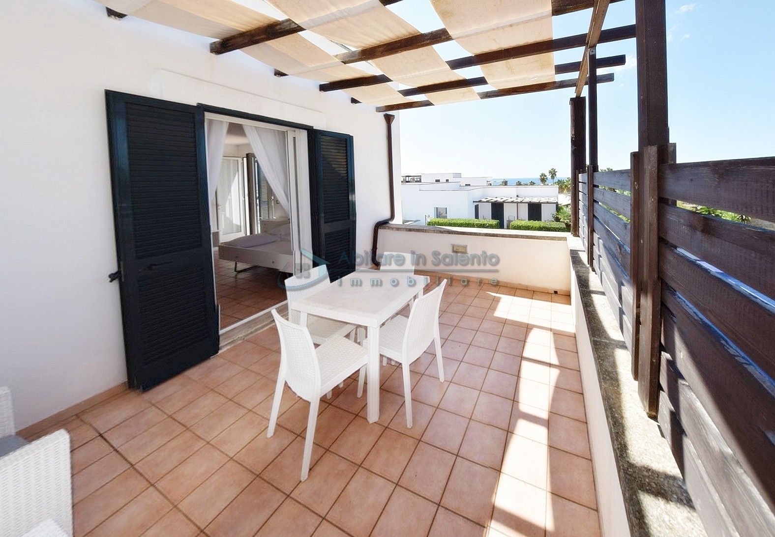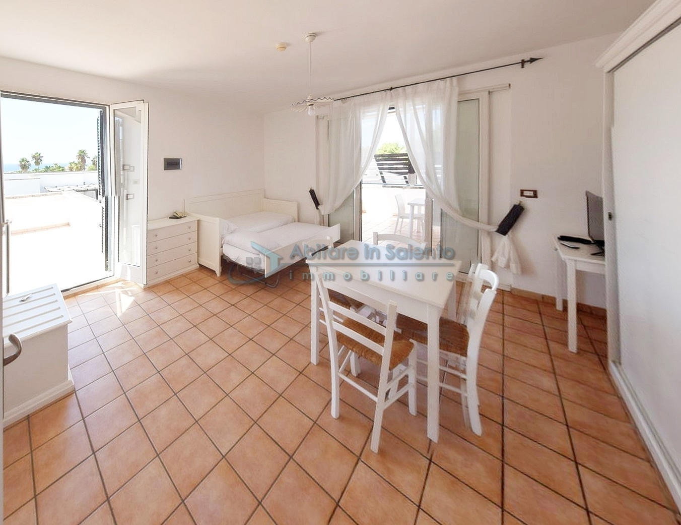 MARINA DI LEUCA – In the enchanting setting of Santa Maria di Leuca, the pearl of Salento, within a 4-star hotel complex featuring a saltwater swimming pool, wellness center, and restaurants, strategically located to offer breathtaking sea views just a few hundred meters from the coast, we offer for sale a cozy, well-furnished one-bedroom apartment. The property is equipped with all modern comforts (air conditioning, mosquito screens, etc.), features recent furnishings, and is held under a timeshare arrangement, with a surface area of approximately 50 square meters. The unit is located on the first floor with an independent entrance via an external staircase and comprises a spacious front terrace with sea view, a bright living room with kitchenette, sofa bed, TV, and dining table, one bedroom, a bathroom, and access to a charming side terrace also with sea view, featuring a covered patio with awnings, a small table, and rattan armchairs. The price refers to the 27th week of the calendar year (first week of July). An excellent investment.